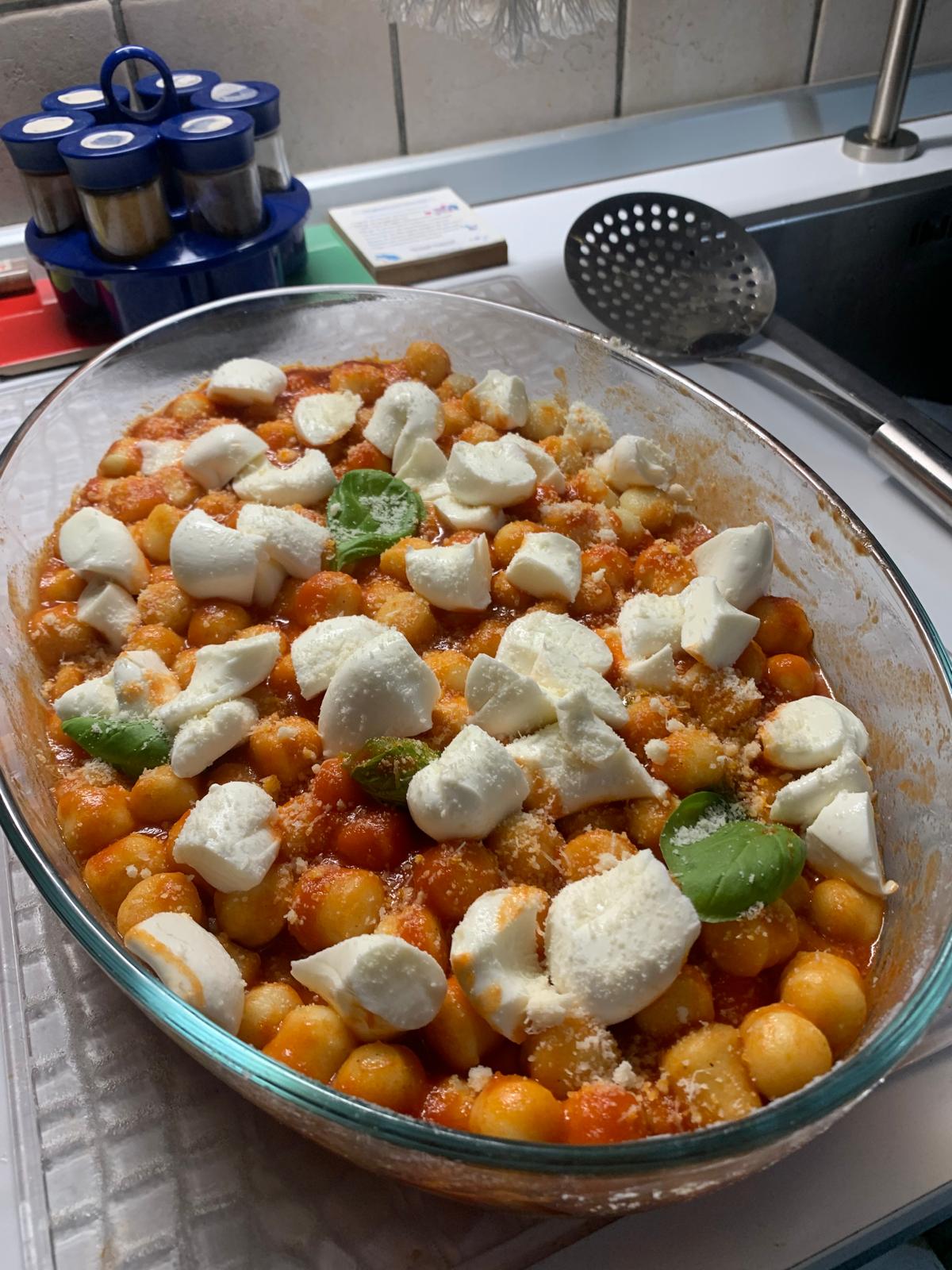 - Transfer the gnocchi and sauce mixture to a baking dish.